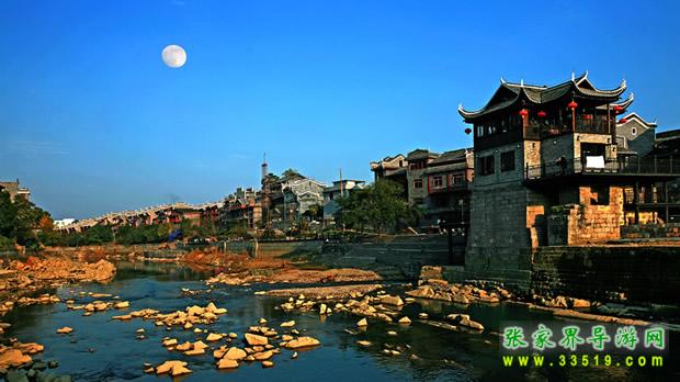 乾州古城城池小巧玲瓏,石城墻垣逶迤回環(huán)1980m,高5m,方溶江穿城而過(guò),沿江古街上被歷代行人的腳磨得光亮的青石板,既自然又精巧地鑲嵌著,沿街建有苗族特有的民宅——吊腳樓,具有濃郁的民族風(fēng)格。
