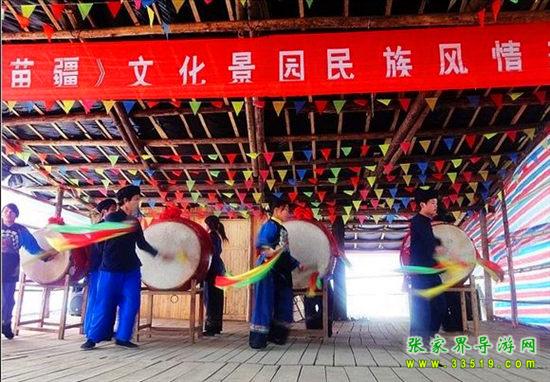 夢(mèng)幻苗疆進(jìn)寨必須經(jīng)過(guò)苗族人民接待遠(yuǎn)方賓客的歡迎儀式“攔門(mén)三卡” 唱攔門(mén)歌、喝攔門(mén)酒、敲苗家花鼓,通過(guò)后,方能進(jìn)寨。