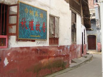秋瑾故居位于湘潭市十八總由義巷。這位近代史上杰出的巾國英雄、婦女解放運動的先驅(qū),在這里度過了8個春秋。離大碼頭不遠(yuǎn)處有一條寬敞的小巷叫由義巷,巷兩旁墻高院深,大多是官紳富商之家,也開設(shè)了幾家當(dāng)鋪、錢莊。進(jìn)巷口十多丈遠(yuǎn)處,有一棟青磚青瓦麻石門樓的鋪面,大門上首有一塊漢白玉石刻招牌“義源當(dāng)”,這是湘潭有名的義源當(dāng)鋪。