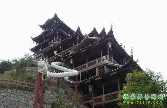 望郎峰北隔幽谷西望,一巨大石壁高聳云端,面寬達百米。因受風雨剝蝕,流痕結網(wǎng),與頂端參差不齊的峰石結合,構成錯落有致的一幅壁畫:林木掩映的圍墻之內,池塘水榭,墻垣瓦梁,依稀可見。還有幾座吊腳樓,幾座寺廟,其間仿佛有人來往。雨天,云霧飄拂,樓臺墻垣若隱若現(xiàn),儼然海市蜃樓。