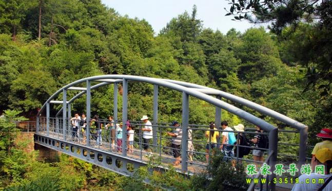 這是一座鋼棧橋,全長(zhǎng)23.8米,凈跨20.4米,寬1.9米。下梁是兩根鋼質(zhì)工字梁,上梁是兩根鋼管拱梁,鏈接兩根工字梁的次鋼梁14根,水平鋼管5根。殼體小巧玲瓏,連接兩座結(jié)構(gòu)復(fù)雜的山峰,構(gòu)成一道離奇絢麗的連心景觀。