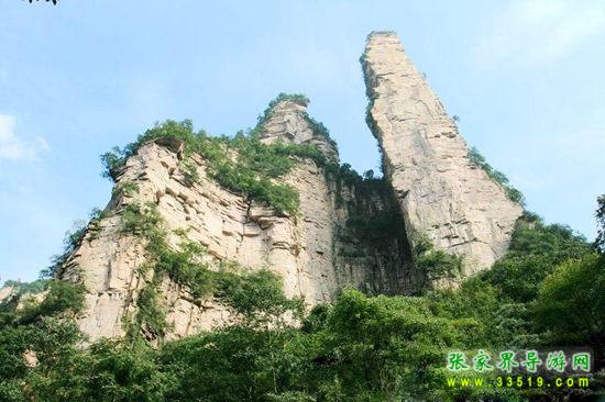 說(shuō)到討好老婆,豬八戒可謂這方面的專(zhuān)家。您回頭看,不遠(yuǎn)處一支長(zhǎng)有一些小樹(shù)的石峰,頂部分了丫,像一個(gè)英文字母“Y”,很像頭戴綠色小帽的豬八戒背著他身材嬌小的老婆(有人開(kāi)玩笑說(shuō)他戴的是“綠帽子”,背的是“小老婆”)。小老婆撐著一把小陽(yáng)傘,還正在背上一扭一扭的呢!八戒的嘴最形象,嘟得老長(zhǎng),好像背了很久,累得不行了,正喘著粗氣——您千萬(wàn)可別看不起豬八戒先生,他魅力足著呢,他不但能吃會(huì)玩、開(kāi)朗大方,而且溫柔多情,雖說(shuō)長(zhǎng)相“安全”了一點(diǎn),但特別擅長(zhǎng)哄女孩子開(kāi)心,不少窈窕淑女就喜歡他這種“好逑的君子”。