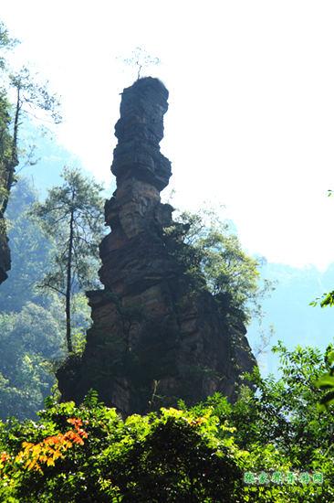 有緣千里來(lái)相會(huì),萬(wàn)水千山總是情。“曾經(jīng)滄海難為水,除卻巫山不是云。”前方這支高300多米的石峰,是不是很像一對(duì)情侶?男的身材高大,頭戴頭盔,身披鎧甲,右手摟著女人的腰,左手撫著女人的肩膀。女的身材豐滿(mǎn),面容清秀,兩眼深情地凝望著自己的愛(ài)人。兩人含情脈脈、情意綿綿的樣子好像有千言萬(wàn)語(yǔ)三天三夜也說(shuō)不完。您猜猜看,他們是在互相傾訴離別的痛苦呢,還是在相互表達(dá)重逢的喜悅?有詩(shī)人這樣寫(xiě)道:“半是愛(ài)憐半是悲,少?gòu)能娢槔戏交?。糟糠啜泣將軍淚,化作春風(fēng)滿(mǎn)谷吹。”相傳這男的是明代抗倭?xí)r一位土家族將軍,一打完仗就千里迢迢,風(fēng)塵仆仆地趕回來(lái)和愛(ài)人相會(huì)。他連頭盔和鎧甲都沒(méi)來(lái)得及換!這女的自從和心愛(ài)的情人離別后,朝思暮想,茶飯不思,“衣帶漸寬終不悔,為伊消得人憔悴”。她清秀的臉上仍顯得有幾分憔悴,卻格外楚楚動(dòng)人!此情此景,您看到了嗎?您看到的是石頭,還是愛(ài)情?山風(fēng)吹在石壁上的聲音和著金鞭溪的流水聲,好像一聲聲祝福:祝您愛(ài)情美滿(mǎn)!愿天下有情人終成眷屬!