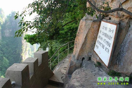 由寨門往上是頗陡的坡,幾十米外有一臨崖平臺,兩三條槍架著,易守難攻。幾米外是烏龍寨的第一道鬼門關“一步難行”。小路一個急彎向右,一塊巖石兀然突出,人必須緊貼著巖壁,慢慢轉過去,一不小心,就會墜入山崖,只要派一個人持刀守候,再多的人也不在話下。