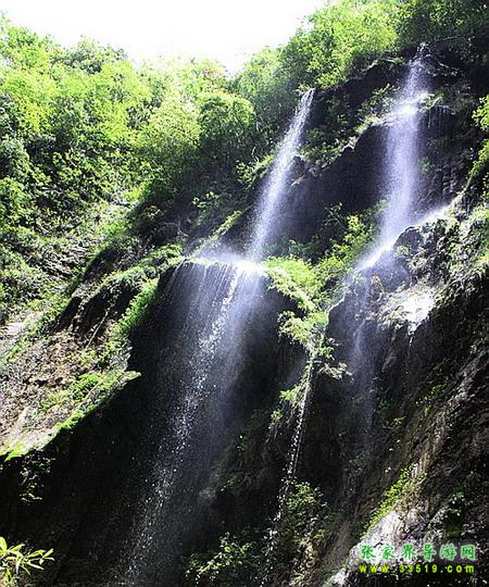 【珍珠墻】過(guò)了神泉橋,請(qǐng)大家留步,做一個(gè)短暫的停留。請(qǐng)大家看,我們的面前,石壁之上,生長(zhǎng)著很多植物,很多草類,山上的泉水沿著石壁,以均勻的流量漫流下來(lái),在這些草葉上、枝枝蔓蔓上形成了一個(gè)個(gè)潔白晶瑩的水珠,大家看像不像珍珠?游客朋友們都將這堵石壁叫做珍珠墻,掛滿珍珠的石墻啊。