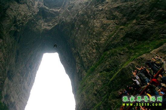 天門(mén)洞是天門(mén)山最具有代表意義的景點(diǎn),它位于天門(mén)山山體的中上部,海拔1300米,門(mén)高131.5米,寬57米,深60米,是世界上最高海拔的天然穿山溶洞。