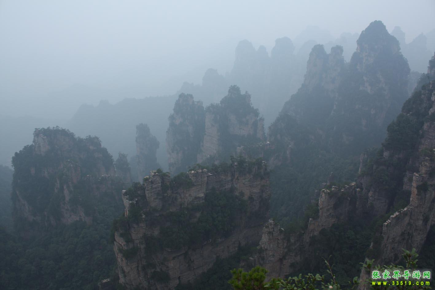 自乾坤柱觀景臺向西轉過一彎,有頂端平整的巖嘴突出崖沿6米左右,臨絕壁半面有四個邊長相等的天然鈍角,銀灰色銅管欄桿圍護,左右石凳排列,別致而高雅。憑欄極目,遠處六巨峰兩兩相對,排列成陣,頂天立地,氣勢磅礴。另有兩峰如屏,橫斷天際。兩峰屏、六峰柱之間的谷中,四座瘦長石峰次第而下,自遠而近,由高到低,連成一線,長達兩千多米,有如梯級。在這四座瘦長石峰中上部,另有兩巨峰偎依,渾圓如柱。據(jù)說是如來佛伸出的兩根指頭,其用意如何,至今無人能解。其下有巨石構成的天然神殿,如雨后晴明,殿內佛像依稀可見。右側一峰頂部似靴,據(jù)說是登“步步高”上天梯的神人走得匆忙,遺忘一只在此。攀欄俯視,300多米深的絕壁根前,有兩排峰體如古城門,八字排列,墻壁斑駁陸離,古野凄涼。古城門與步步高天梯相聯(lián)成趣:昔人拾級登天去,此地空余古城門。“昔人”是誰?“古城門”建于哪朝哪代?留與后秀破解。這里雖有諸多疑團使人困惑,但是充滿幽野之美,引人入勝。