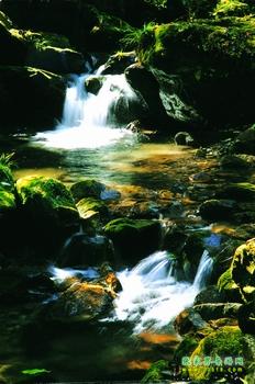 為沙刀溝第一景。一塊崩塌的巨石橫臥溪中。石的一端擱于右岸,供成一孔。溪水穿孔而過(guò),發(fā)出叮叮咚咚的響聲,在溪內(nèi)沖成一個(gè)1米多深的潭。潭水清澈如鏡,潭底紅白砂石光潔晶瑩,魚、蛙時(shí)而嬉游其中。潭兩邊石峰高聳環(huán)峙,闊葉林、灌木叢茂密常青,峰麓遍生苔蘚,如鋪綠毯。山峰、碧空倒映潭底,水中掠過(guò)縷縷白云。潭右上方有一高約50米、直徑約5米的石柱立于路旁,綠葉扶疏,秀麗挺拔,與清心潭陪襯成奇特佳境。立潭觀景,塵念俱消。