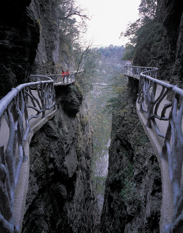 站在棧道上俯瞰群山,古人“會當凌絕頂,一覽眾山小”的感覺油然而生。由于天門山是國家森林公園,植被特別豐富,加上典型的喀斯特地貌,所以,在這條棧道上更能找到一種在乘坐直升飛機飛越熱帶雨林大峽谷的感覺,這平時只能在電影里看到的場景,在這里能讓你身臨其境。