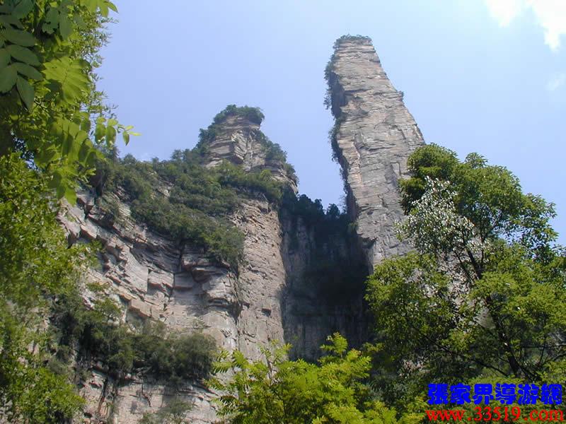 (花果山、水簾洞)孫悟空的花果山水簾洞到了。并不是張家界人過于牽強,胡亂把西游記的事兒往這兒湊,實在是巧合,《西游記》劇組的導(dǎo)游楊潔及唐僧、豬八戒、孫猴子、沙和尚等飾演者,一見到這地方就十分肯定地說:外景地選遍全國,只有張家界才真正是《西游記》筆下的神仙妖魔世界。大家順著我的指向往前看,左前方是帶著僧帽,披著袈裟,嘴中念念有詞的唐僧,緊跟在他后面的那座黑乎乎的石峰當(dāng)然就是沙和尚了;神通廣大的孫猴子半蹲在唐僧后側(cè)手搭涼篷,正在觀察敵情呢;豬八戒哪去了?不用說,不是貪吃貪睡,就是偷偷找小女子搭訕去了,花心去了。