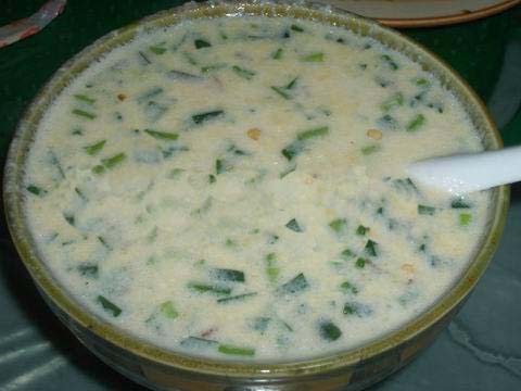 將用水浸泡過(guò)的黃豆用磨子磨碎,摻入切細(xì)的青菜葉,然后用溫火煮熟即可。此樣菜雖做法簡(jiǎn)單,但營(yíng)養(yǎng)價(jià)值極高且味鮮美,為當(dāng)?shù)厝顺S玫囊坏啦恕?/p>